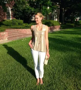 That evening I had a girls night out planned. To take the same outfit into the night I put on wedges. Oh what wedges can do for the psyche. I put a different necklace on and added a bracelet. The picture may not look like the evening but it is!