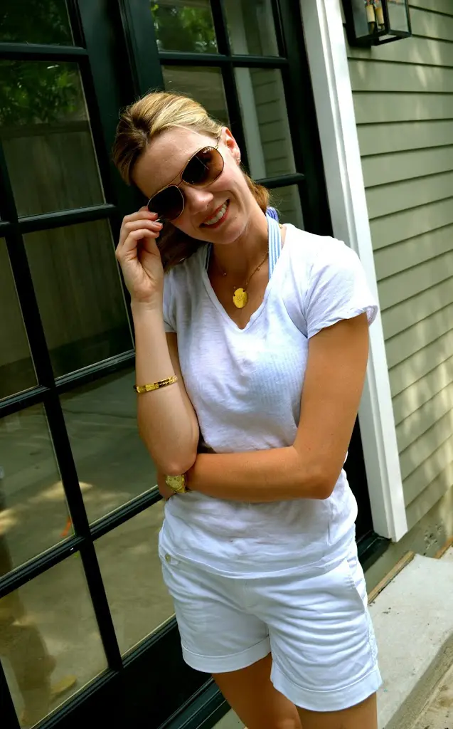 Tissue Tee- J. Crew, Swimsuit- J. Crew, Shorts-Banana Republic, Watch- Michael Kors, Necklace- for similar, Max and Chloe, Short Diamond Necklace – a bientot, Sunglasses-Ray Ban at Nordstrom,