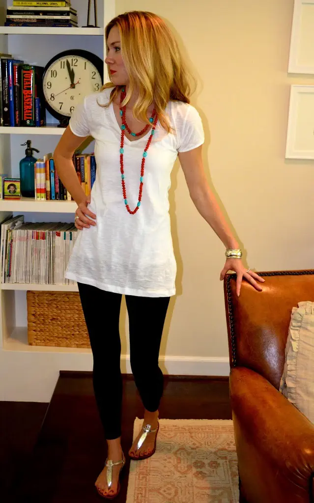 T-Shirt – ZARA and Old Navy for similar, Leggings – Ann Taylor Loft and J. Crew (both have passed the test), Sandals – Sam Edleman, Necklace RPM Creations, Hoop Earrings – Premier Jewelry, Cuff – Gift, Ring – Barry Brinker