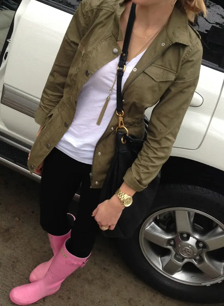 Jacket- Rubbish, T-shirt- J.Crew, Jeggings- Citizens of Humanity, Necklace- J.Crew (not available) here for similar, Wellies- Hunter (color not available), Purse- Marc Jacobs, Sunglasses- Ray Ban, Watch- Michael Kors