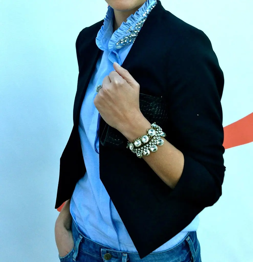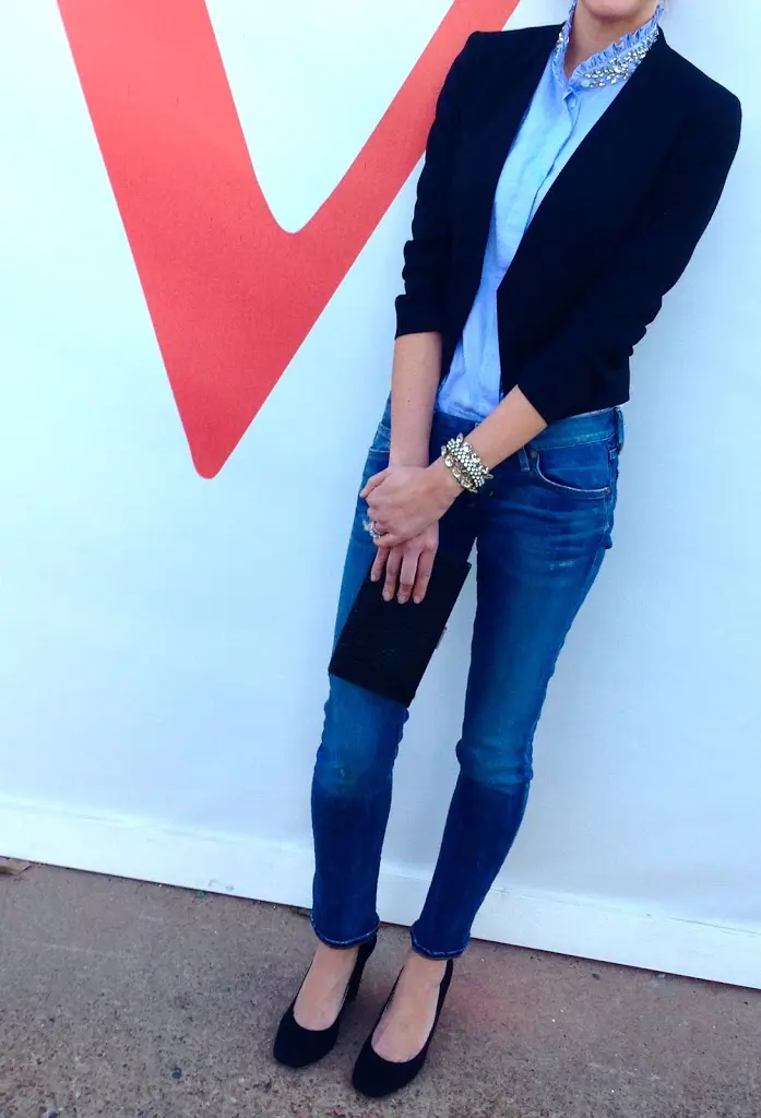 Blazer-H&M Nordstrom for similar, Top- J.Crew, Jeans- Citizens of Humanity, Shoes- J.Crew for similar, Necklace (worn as bracelet)- J.Crew, Sunglasses- Ray-Ban, Clutch-Banana Republic years ago Nordstrom for similar