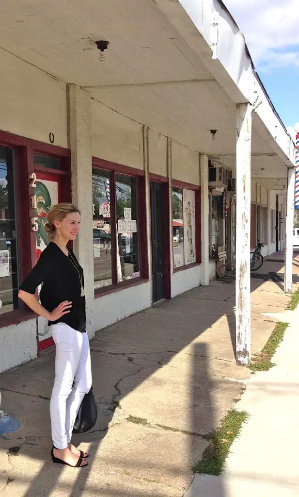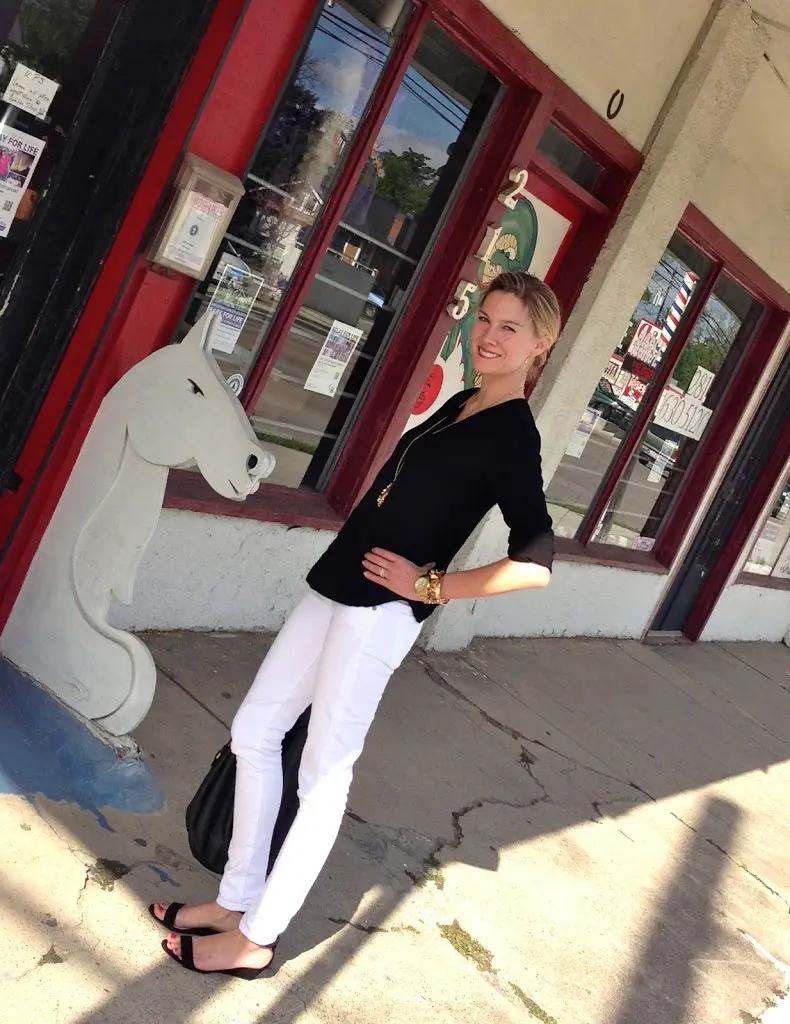 Oh, but wait, look at the cool barber shop pole on the right of the picture! Now is it a cool scene?!?! I’m cracking up. If you’re ever stumped with what to wear, you can never go wrong with black and white. Truly a classic that will stand the test of time.
