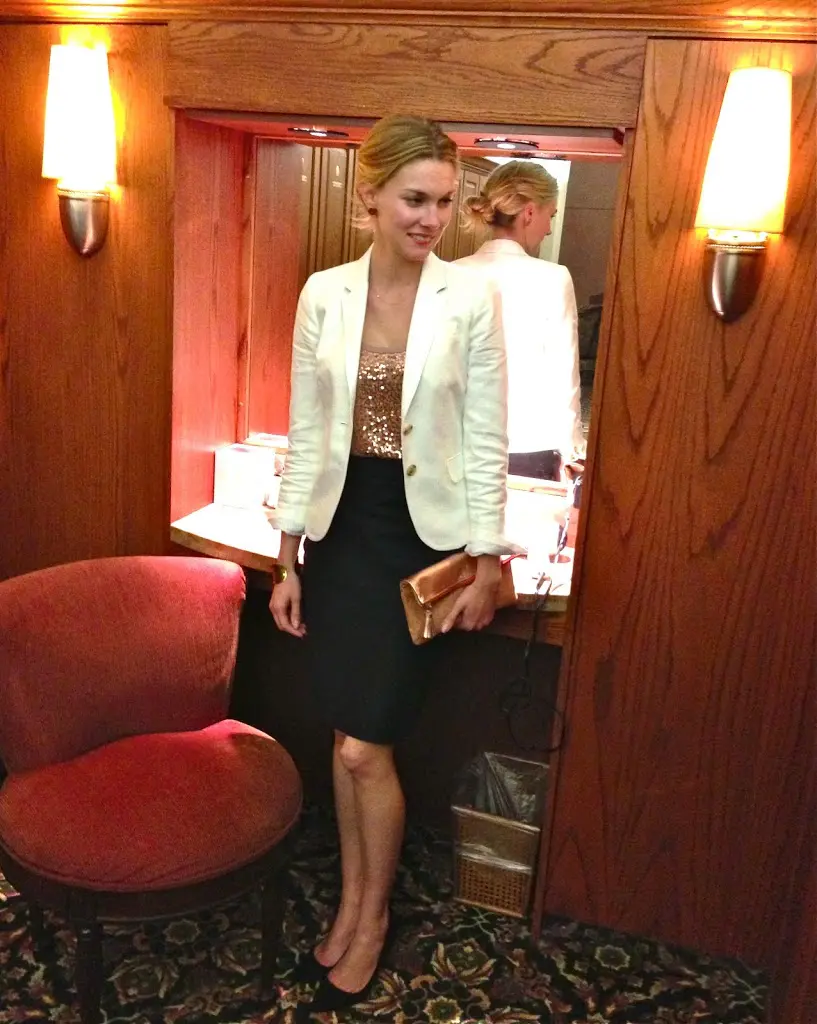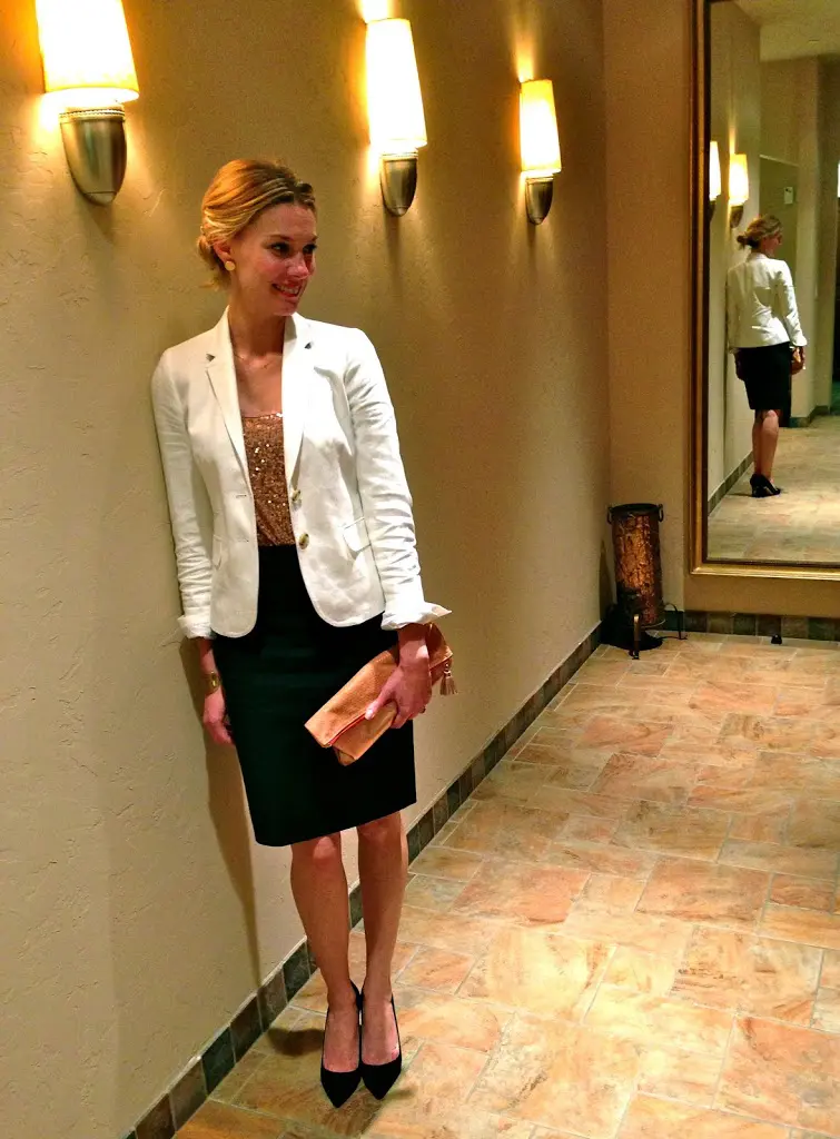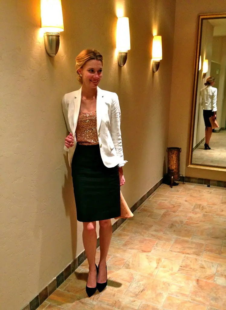 I found myself in just this kind of situation on Saturday evening. I paired a black pencil skirt with a sequined tank for a little glitz and to dress up the skirt. You can tuck almost any shirt into a pencil skirt for a more tailored look and to give yourself a nice waistline. I’ve also worn a black top tucked in with a thick black belt to give the illusion of a dress. It’s like an ever-changing cocktail dress! A pencil skirt may not be appropriate for all cocktail parties, but for the vast majority, it is. I had my sister take pictures of me in the locker room at the event because it was too dark everywhere else- ha!