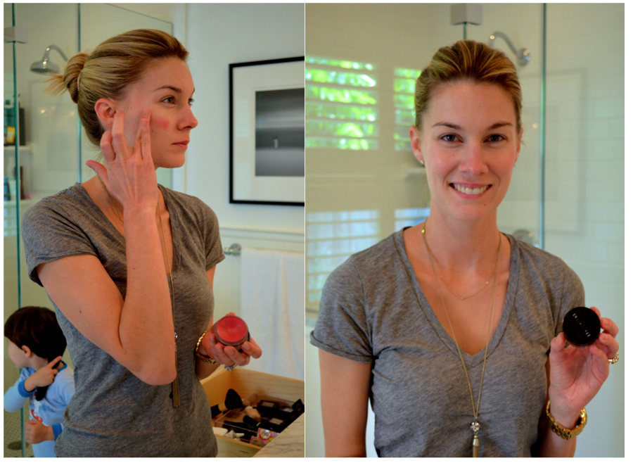 So, I guess I like to apply everything with just my fingers. It takes the least amount of time and I don’t have to carry around a brush. This cream blush by Bobbi Brown in pale pink stays on and gives me a pop of color in 15 seconds. It has the same effect of pinching your cheeks, but the color stays. I have been known to do this entire make up routine while at a stop light.