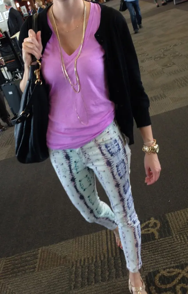Last weekend I went on a trip to LA with my husband, andI thought I’d do the same packing plan for myself that I do for my clients and share it with you. Here are the pictures of my outfits as I planned them, followed by a picture of me wearing them. I am very particular about my travel outfits and this one fit all my requirements- check out my Elaine post here! This was a very funny moment with my husband, because we were both feeling totally awkward as I am posing in the airport and he is taking my picture. You could read the awkwardness all over my face, so I chopped it off -ha!