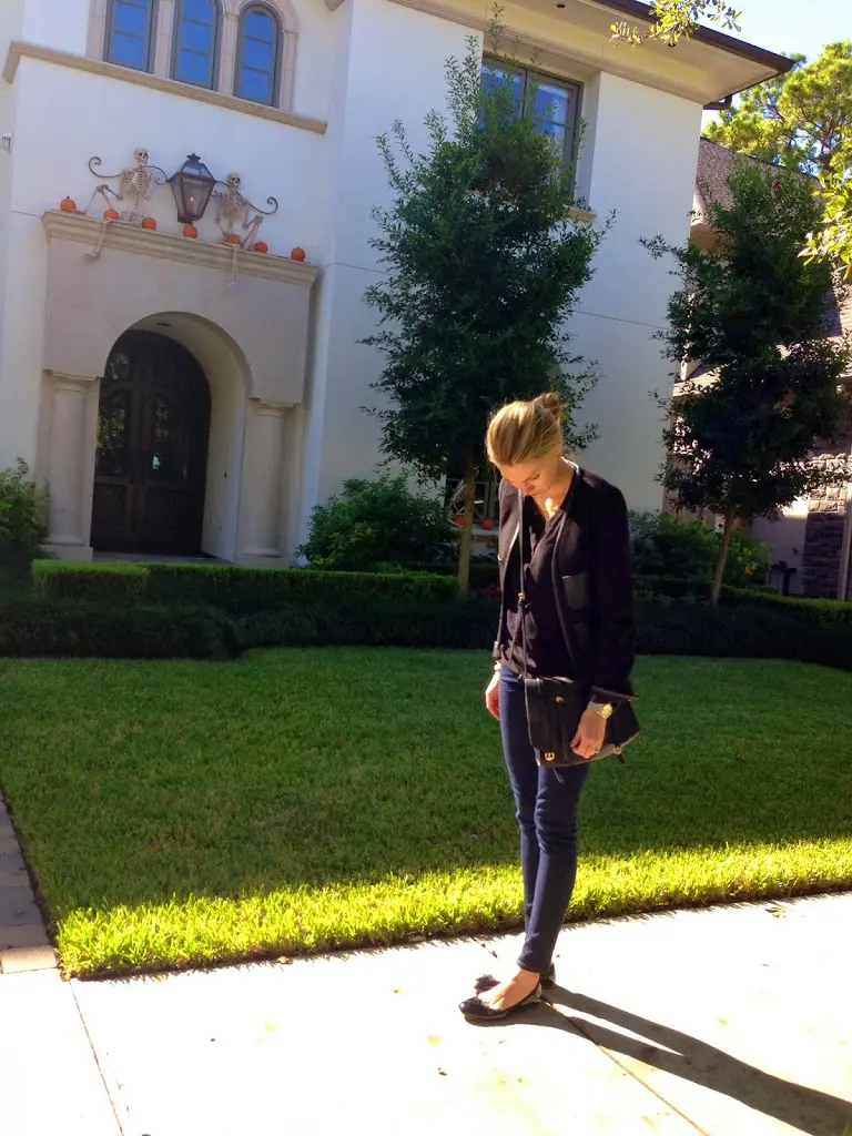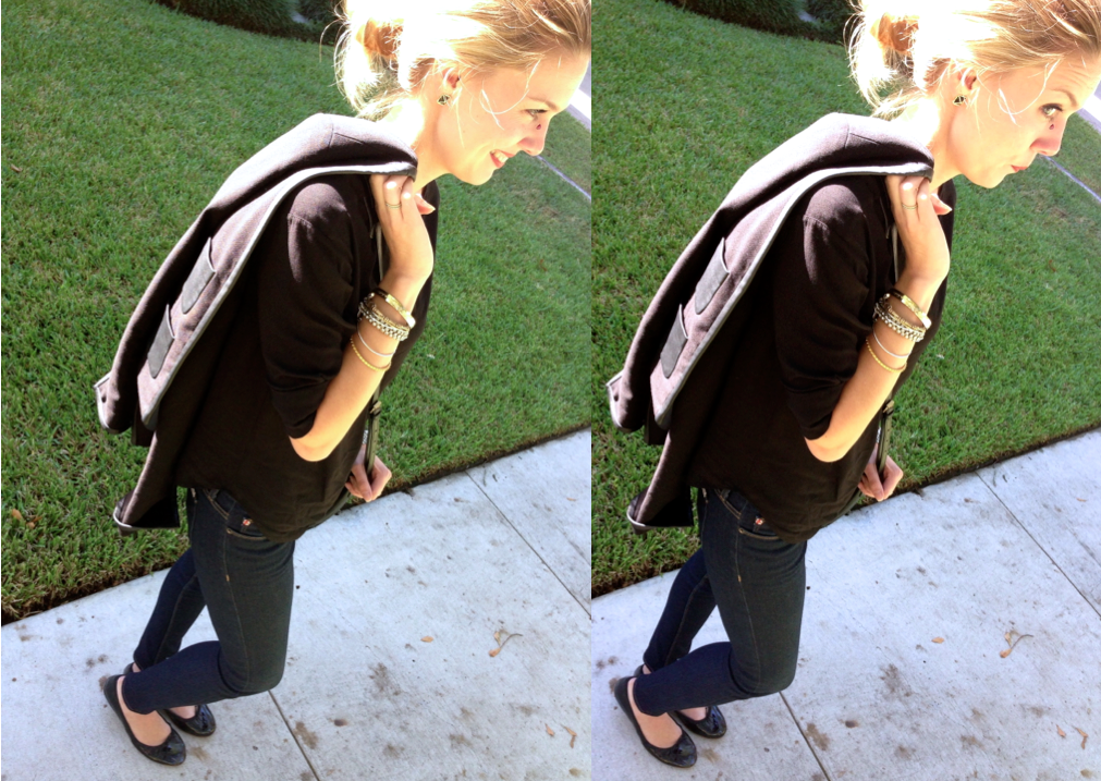 Top- Splendid for similar, Jacket- Here and Here for similar, Jeans- Hudson, Flats- Bloch, Bag- Linea Pelle