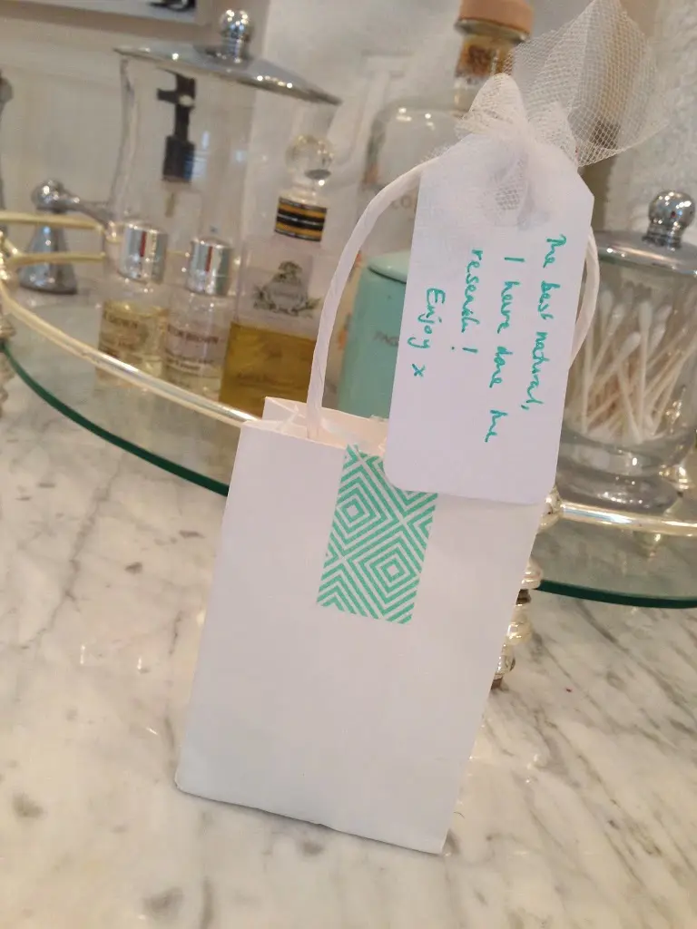 I recently attended my girlfriend Sandy’s birthday party. On our way out she gave us these cute little bags. The card reads, “The best natural, I have done the research!”. I was so intrigued! What was inside?! It was Essie ‘Mademoiselle’ nail polish! Best party favor EVER! Not only was it thoughtful, but I was so excited to try HER favorite natural polish! Such a great idea for a party favor. I’m so copying this idea! Thank you, Sandy!