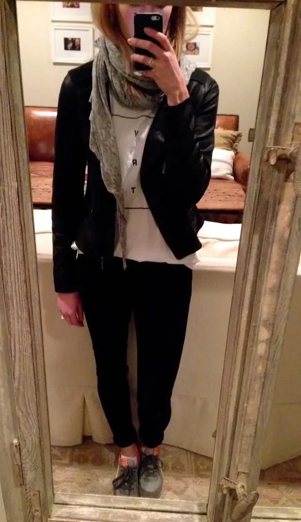 First, let me apologize for the picture quality in the next few pictures. I just moved into a new house and I haven’t hung any mirrors yet -ha! But after looking at these pictures, it’s one of my top priorities. Anyway, my new neighbor has been wearing her Patagonia puffer vest with a bunch of outfits, and she inspired this look. Why not wear my puffer vest with my pink sweatshirt and black booties?!?! Thank you, neighbor!