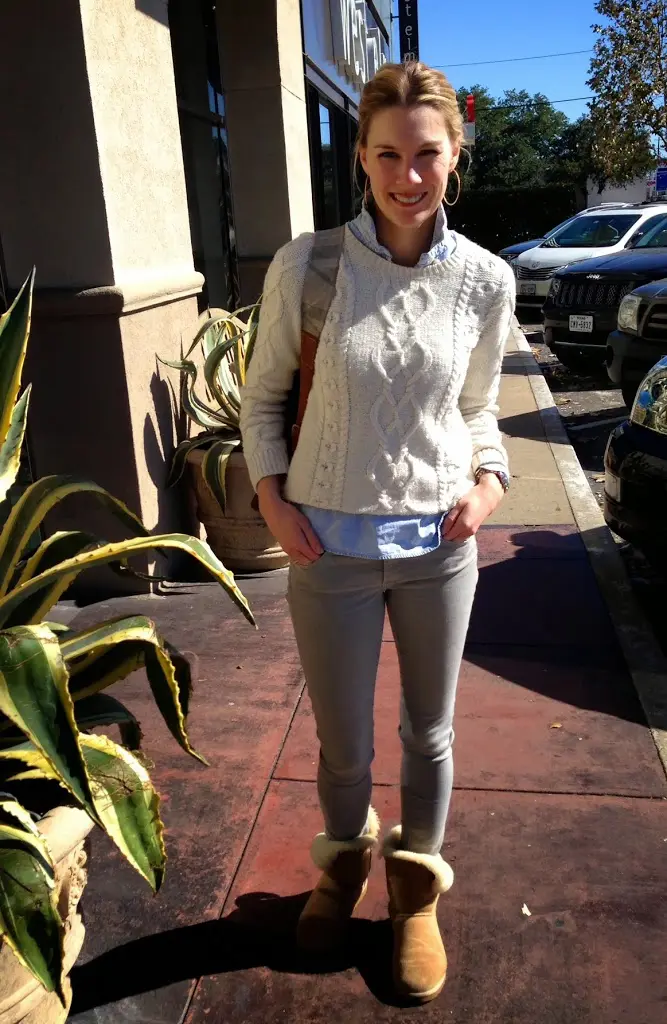 Sweater- Gap, Shirt- J.Crew for similar, Jeans- AG, Shoes- Uggs, Earrings- Nordstrom, Bag- Stash & Co.