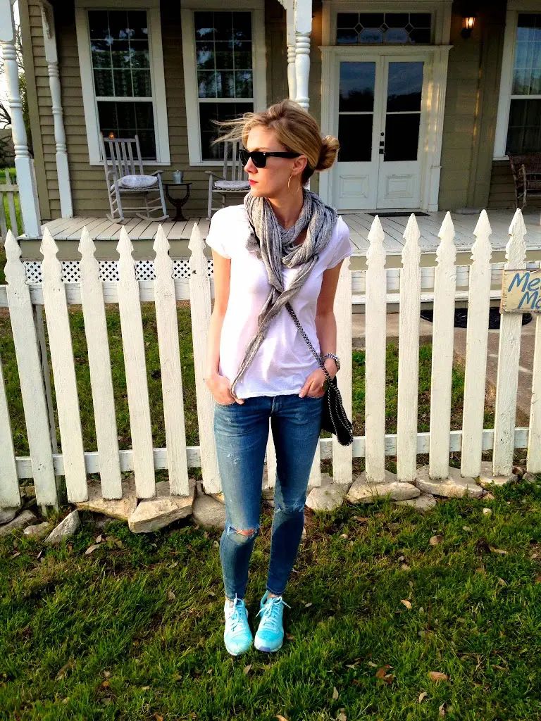 Outfit links:Tee- Splendid, Jeans- Citizens of Humanity, Scarf- Free People, Sunglasses- Ray Ban, Bag- Stella McCartney, smaller version here, Earrings- Nordstrom, Watch- Michael Kors, Sneakers- Nike