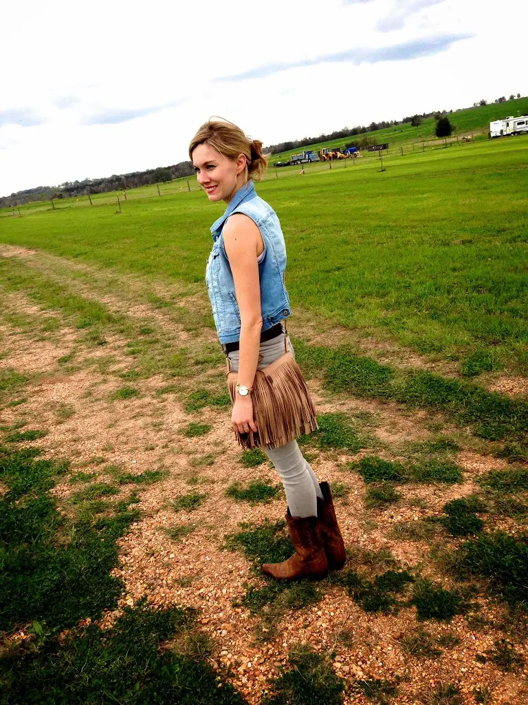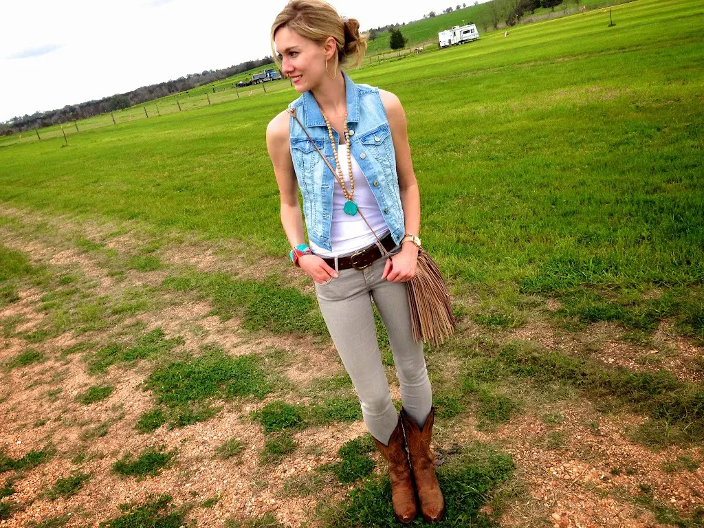 The cowgirl boots and jean vest are perfect for a Texas antique fair! You look adorable! 🙂