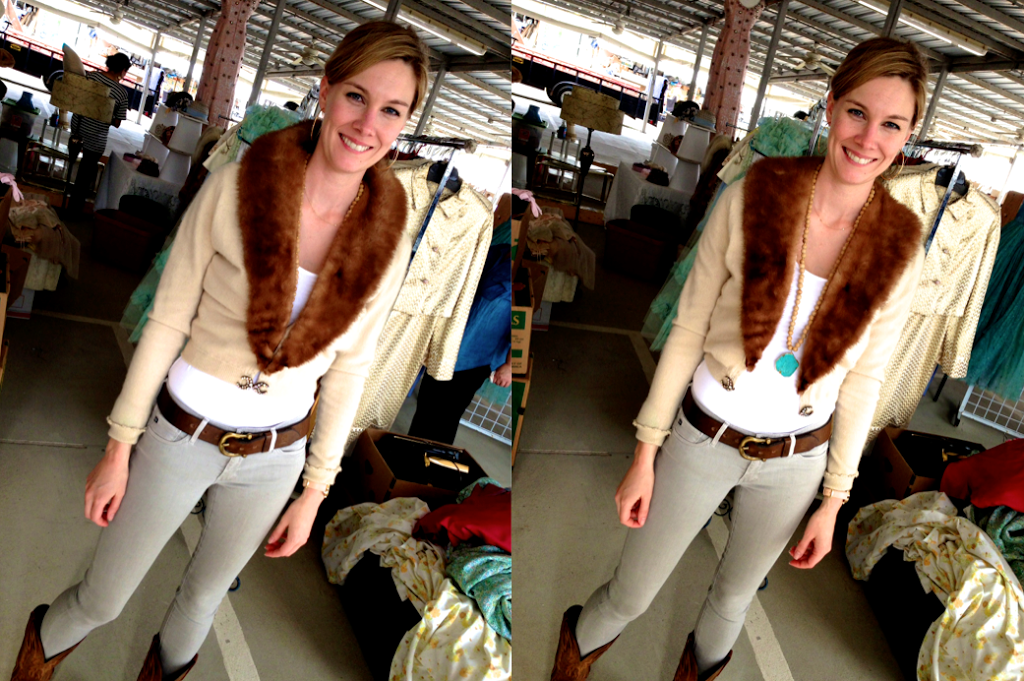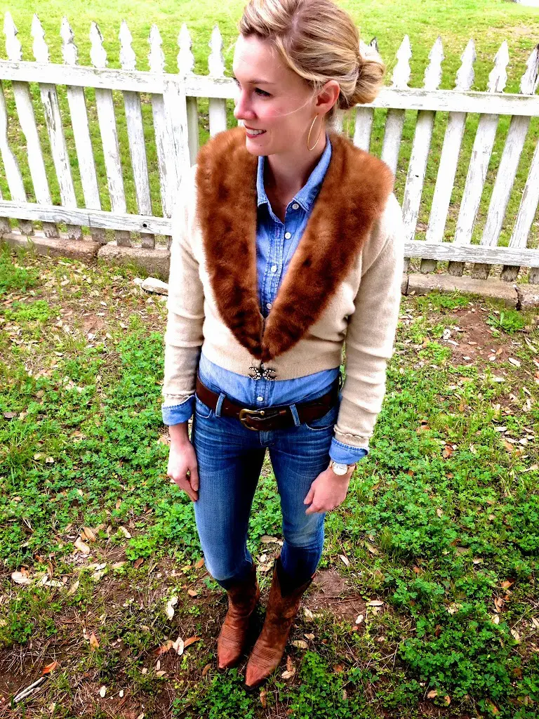 Up next I found this cashmere mink collar cardigan. I pinned a Banana Republic cardigan this winter that reminded me of this sweater. In fact, they have a very similar one (here). But, what’s cool is that my vintage sweater is cashmere and I actually bought it for less than the price of the BR sweater, score! If you are going to Round Top, both the mink and the cashmere sweater were found in Warrenton, behind the Legal Tender Saloon at a booth called Gypsies Antiques. They can also be found in Austin, TX on Burnett Rd. and at Rarethreadsvintage on Etsy.