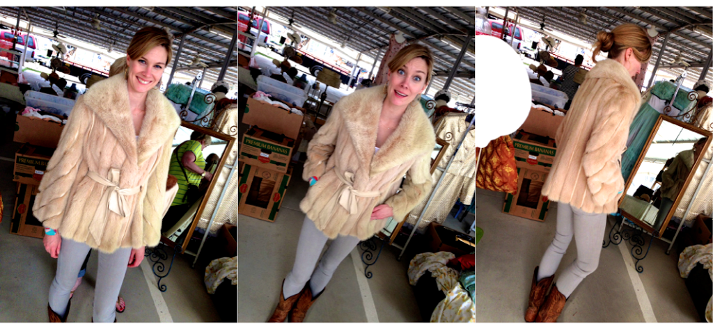 Next, I found Bess’ vintage Mink. No seriously, Bess’ name is embroidered on the inside of the coat. I went nuts over this coat, as you can see (the middle picture is the moment I discovered that the coat had velvet lined pockets). OK, and don’t get mad at me because it’s a fur coat. The damage had been done, the mink was already made into a coat. I was just giving it a new home -ha!