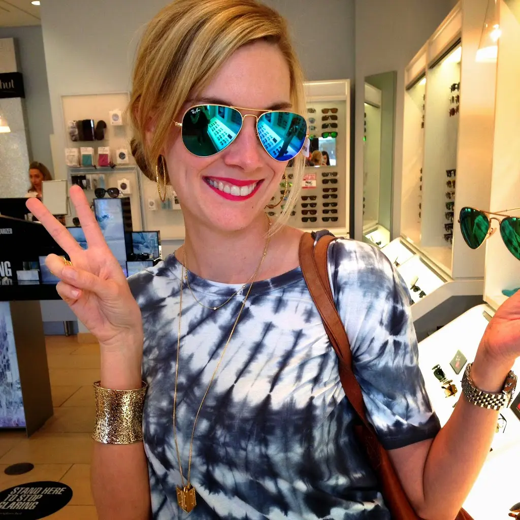 And while I was there I decided to try on a couple of other options for you guys (and for me) -ha! The “flash lenses” are all the rage, as they should be, because everyone looks so cute in them! I had to try them on. They made me feel kinda like a hippie, so I threw up my peace sign -ha! These are the blue flash lenses, and well, maybe my hippie tie dye shirt is telling me something… I can talk myself into a new purchase so fast -ha!