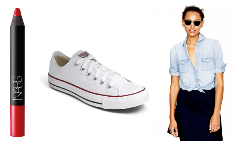 NARS Dragon Girl, White Chuck Taylor Converse, Blue Chambray Shirt