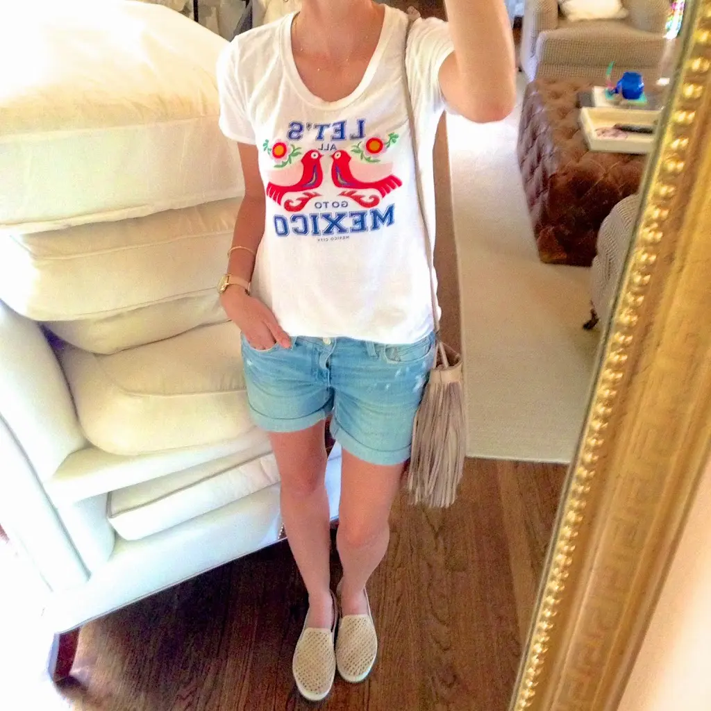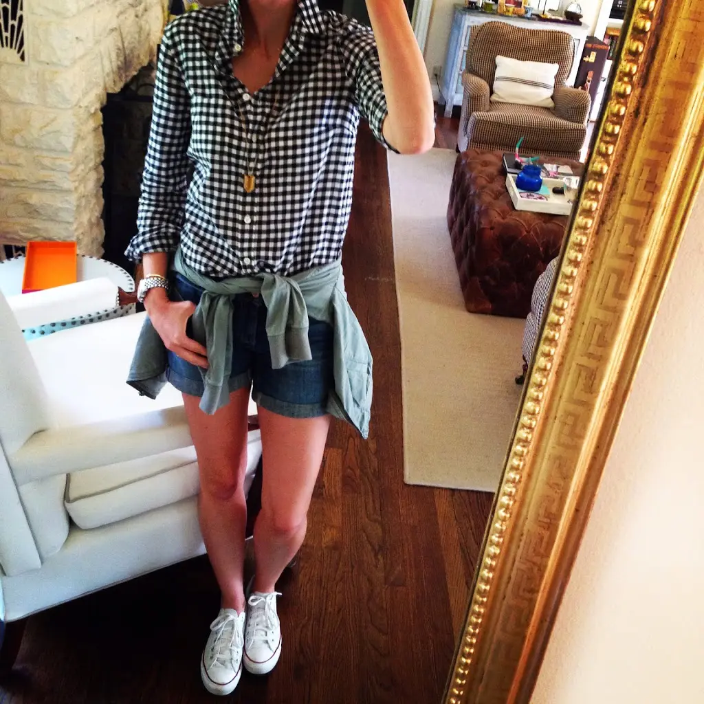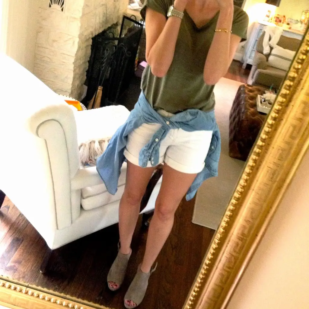 Top- Anthropologie, Shorts- Anthropologie, Chambray- J.Crew for similar, Shoes- Nordstrom, Watch- Michael Kors, Bracelet- Giles and Brother, Earrings- Argento Vivo