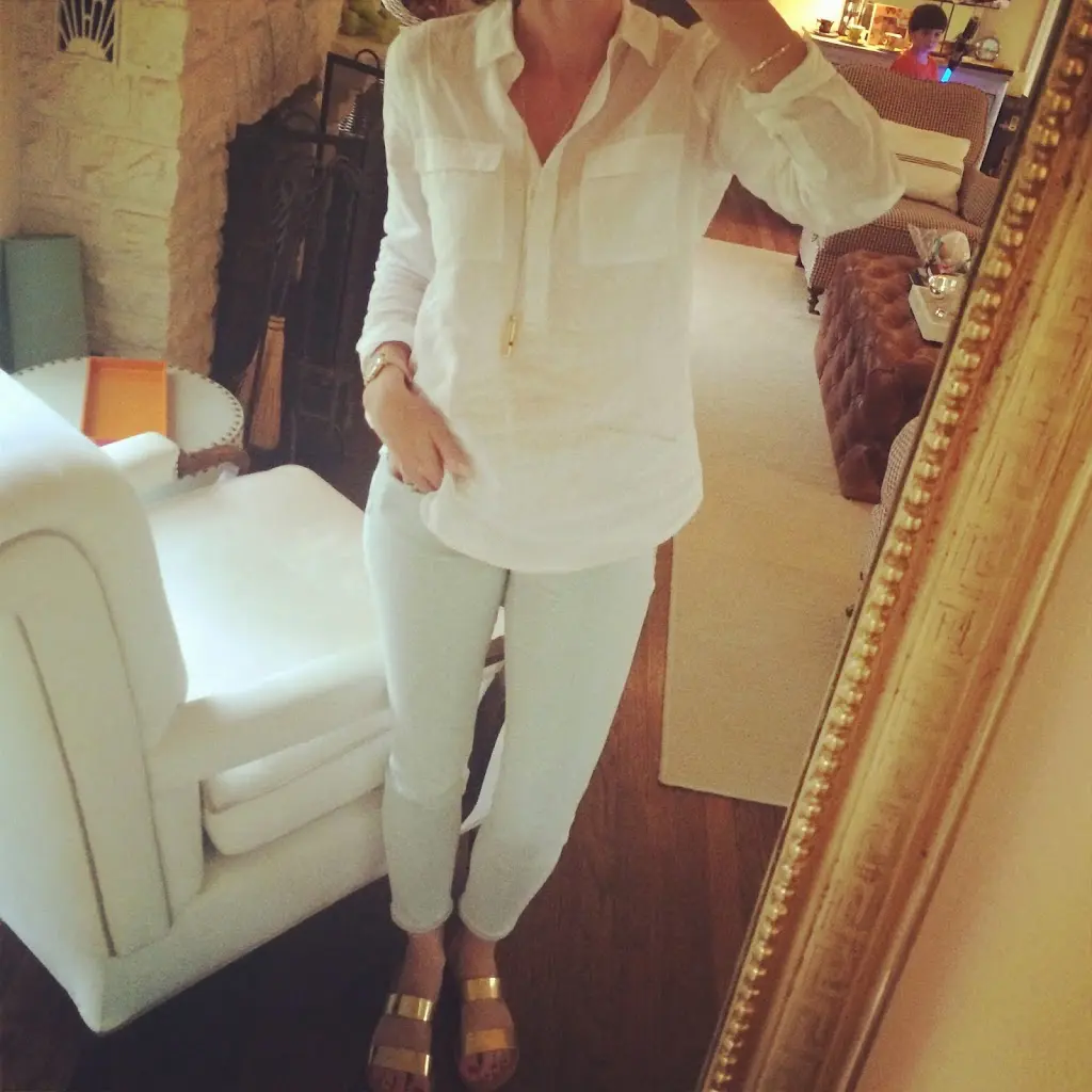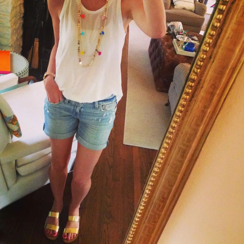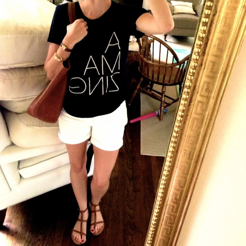 Lately, I have been committed to trying to wear all the clothes in my closet all year long. So here I’m wearing my favorite fall top from last year with my white shorts and sandals. Totally summer-izing.