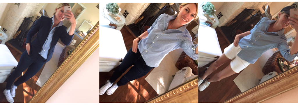 This outfit transitioned throughout the day. I had a breakfast meeting, so I wore a blazer with my jeans and popped the collar of my oxford. It started to heat up later in the day, so the blazer came off. Then it was off to the ball fields for my son’s t-ball practice. It was really hot by that point, so I threw on some shorts and a baseball hat.