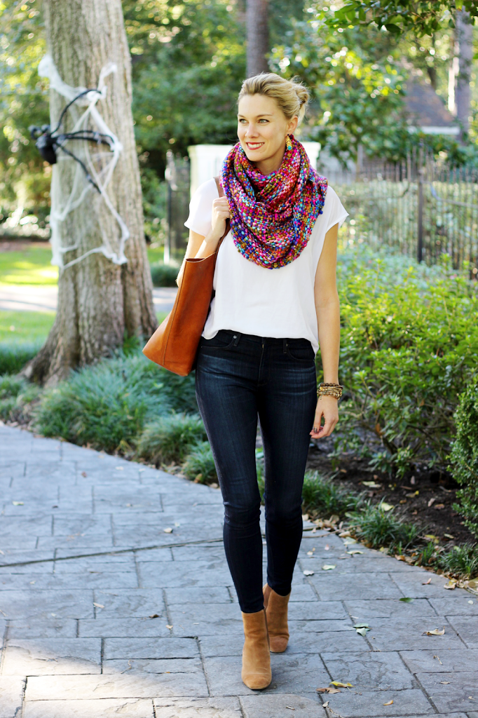Outfit links:Top- Anthropologie, Scarf- Anthropologie, Jeans- AGon SALE, Booties- Nordstrom for similar, Bag- Madewell, Earrings-c/oElaine Turner, Bracelets- Jeny Baker, Alex and Ani, Stella and Dot here and here