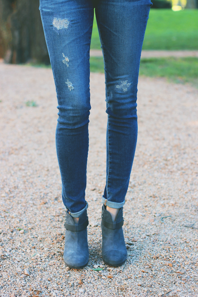 I am currently wearing slightly distressed Paige jeans. They’re a faded blue color and actually look like they have a few “runs” in them instead of holes. They’re really cropped jeans, but I’m a smidge under 5’2″ so they fit me perfectly in the length. 🙂 I don’t know how you could possibly wear a smaller size in those jeans.