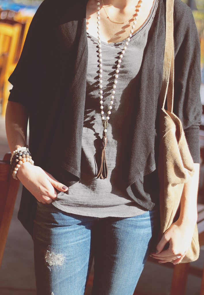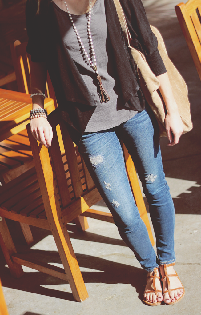 Sweater- Splendid, Top- Anthropologie, Jeans- AG, Sandals- K.Jacques and here for similar, Bag- Urban Outfitters, Earrings- Gorjana for similar, Bracelets- Jeny Baker Designsalsofound at Wisteria,Necklace- Jeny Baker Designsalso found at Wisteria