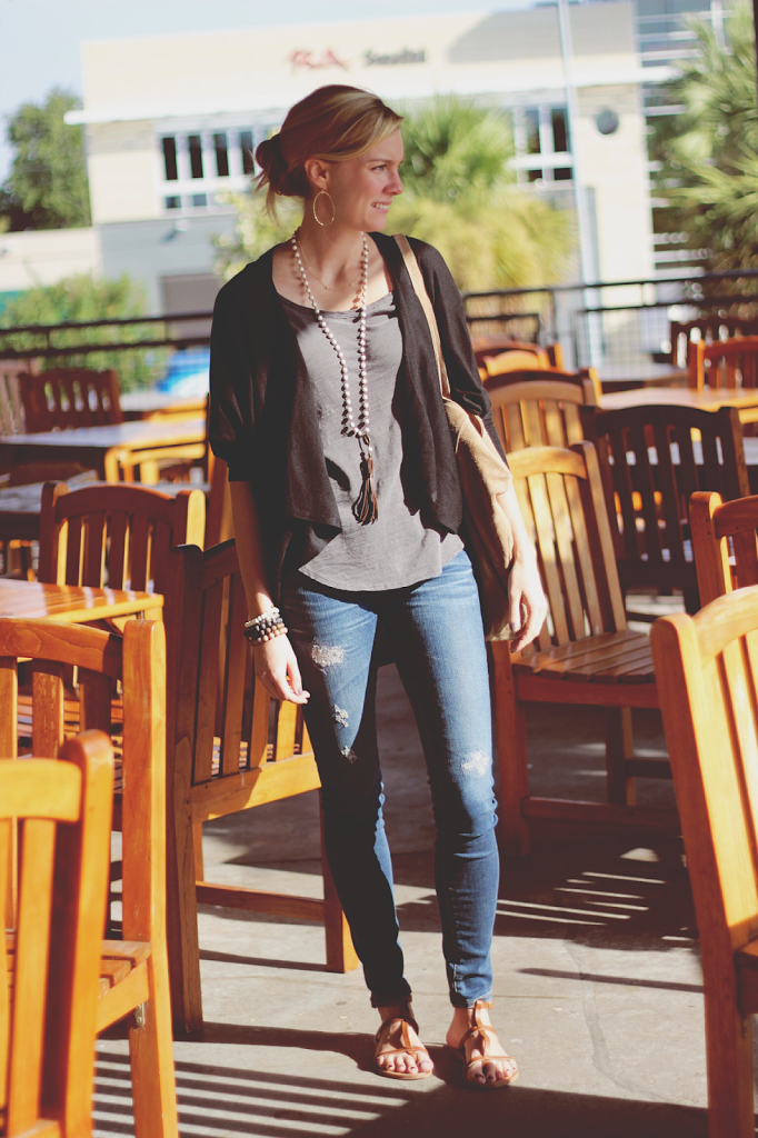 The light layers are great because when it warms up at mid day, my light weight sweater is off! It’s perfect because I’m left wearing jeans, a tee and sandals. On a side note, I’m really loving grey as a transitional nail polish color. I’m wearing Essie “Merino Cool” but my friend had Essie “Take it Outside” on the other day, and Icouldn’tstop staring at her nails.