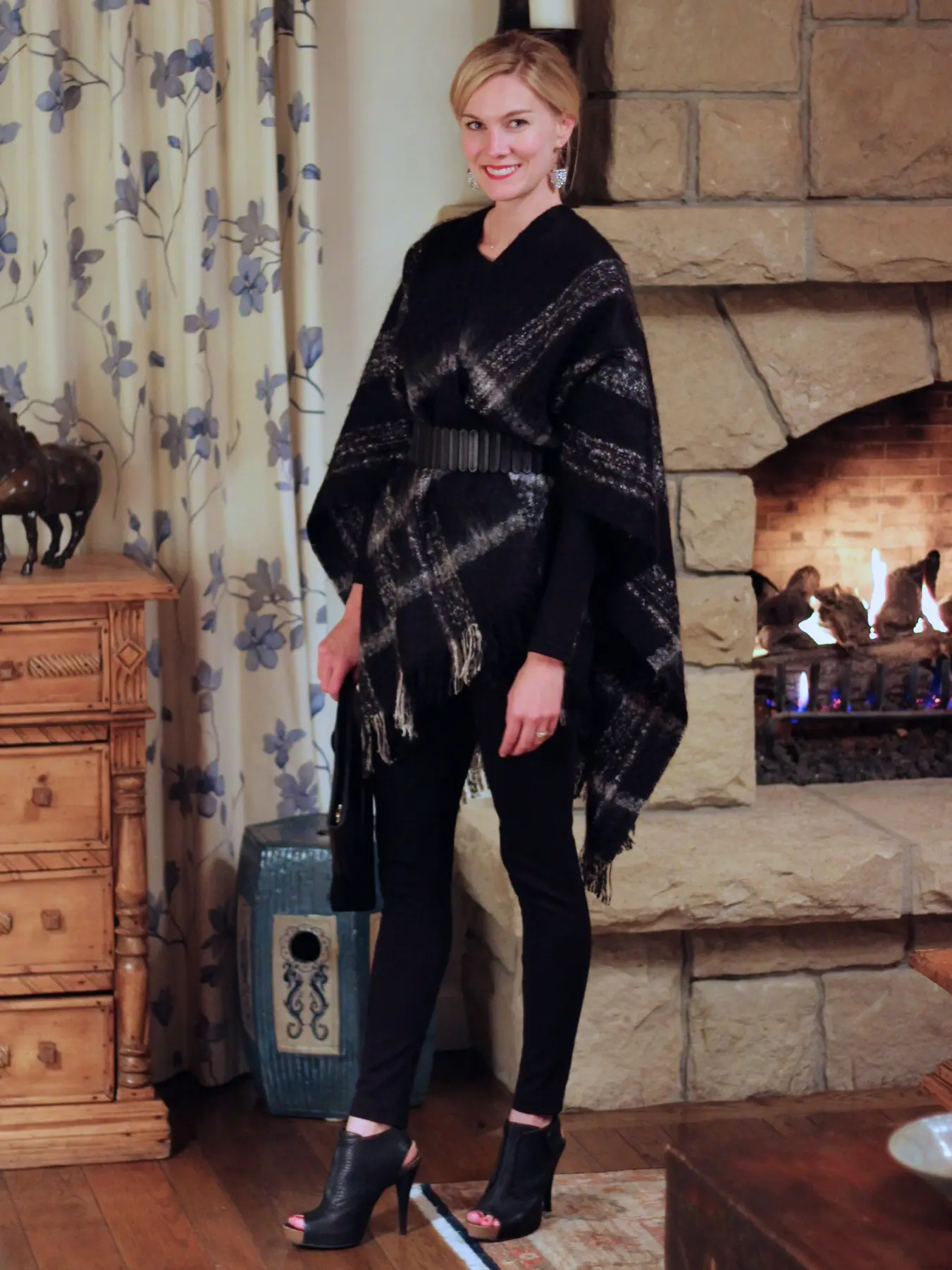My sister, aunt and cousins were shopping with me when I found the Anthropologie cape and we were ALL trying to figure out how to make it work. When I tried it on, I looked like I was being swallowed up by a blanket. Then my sister started bringing me belts. At first, I tried it on with the belt going around the whole thing, which wasn’t very comfortable. Then, I tried it in with the belt going around the front and leaving out the back, ding ding ding! It was the perfect solution and I really loved the way it turned out.