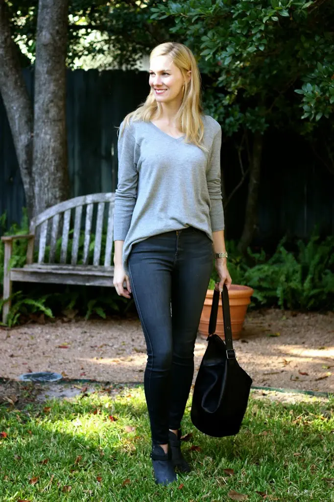 A lot of women prefer high waisted jeans, and it makes sense that they like the extra coverage. It helps avoid the unwanted peek-a-boo crack and the inevitable spillage over the top of the waist band (everyone has it). I really loved the darker grey color of these jeans. Light grey can be so tricky because they show a lot… they’re almost as tricky as white jeans. I also like the ankle length of these jeans.