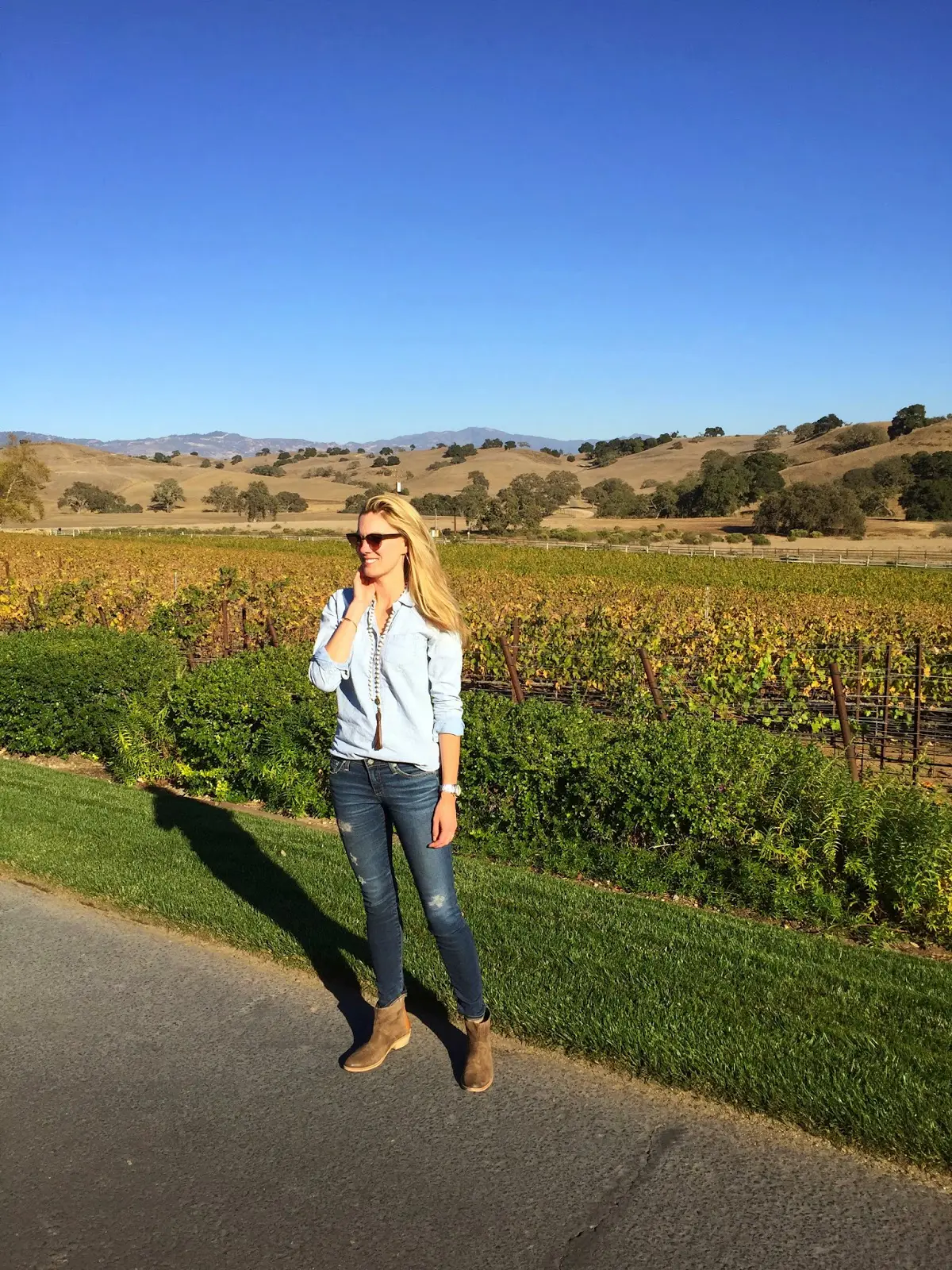 Alright. First up, this is what I wore on our day out to the vineyards. I knew we would be walking, so I wore my comfortable new booties. I think this outfit is a really great example of how styling can add a lot to an outfit. There are lots of styling tricks happening here: I sloppy tucked to show a waist line, I rolled my sleeves for a more casual vibe, I let my necklace do it’s thing (sometimes it would be over one side of the collar, sometimes it would be in the middle), I popped my collar, and I cuffed my jeans just once (sometimes my skin showed and other times it didn’t). Yup, lots of styling tricks for one outfit -ha!
