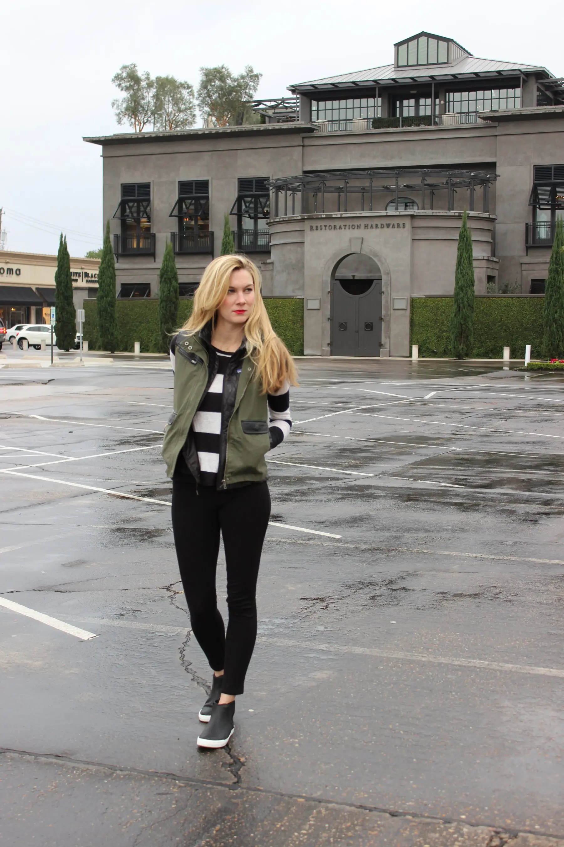 Okay, so I love the army green vest.second, when did you go toHighland Village and there were no cars?! Anyway, you look great.