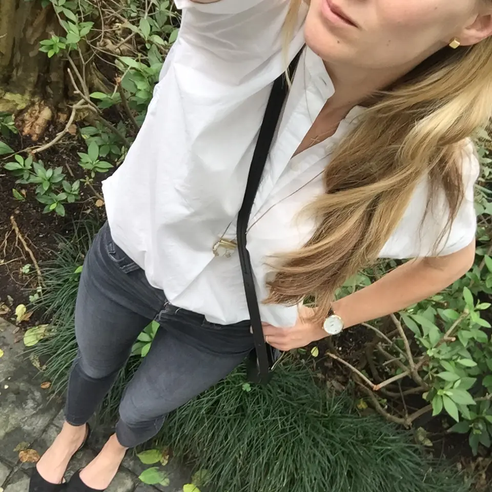 Top- Madewell for similar, Jeans- FRAME for similar, Shoes- J.Crew Factory, Bag- J.Crew, Watch- Michael Kors, Necklace- Argento Vivo for similar, Earrings- Gorjana