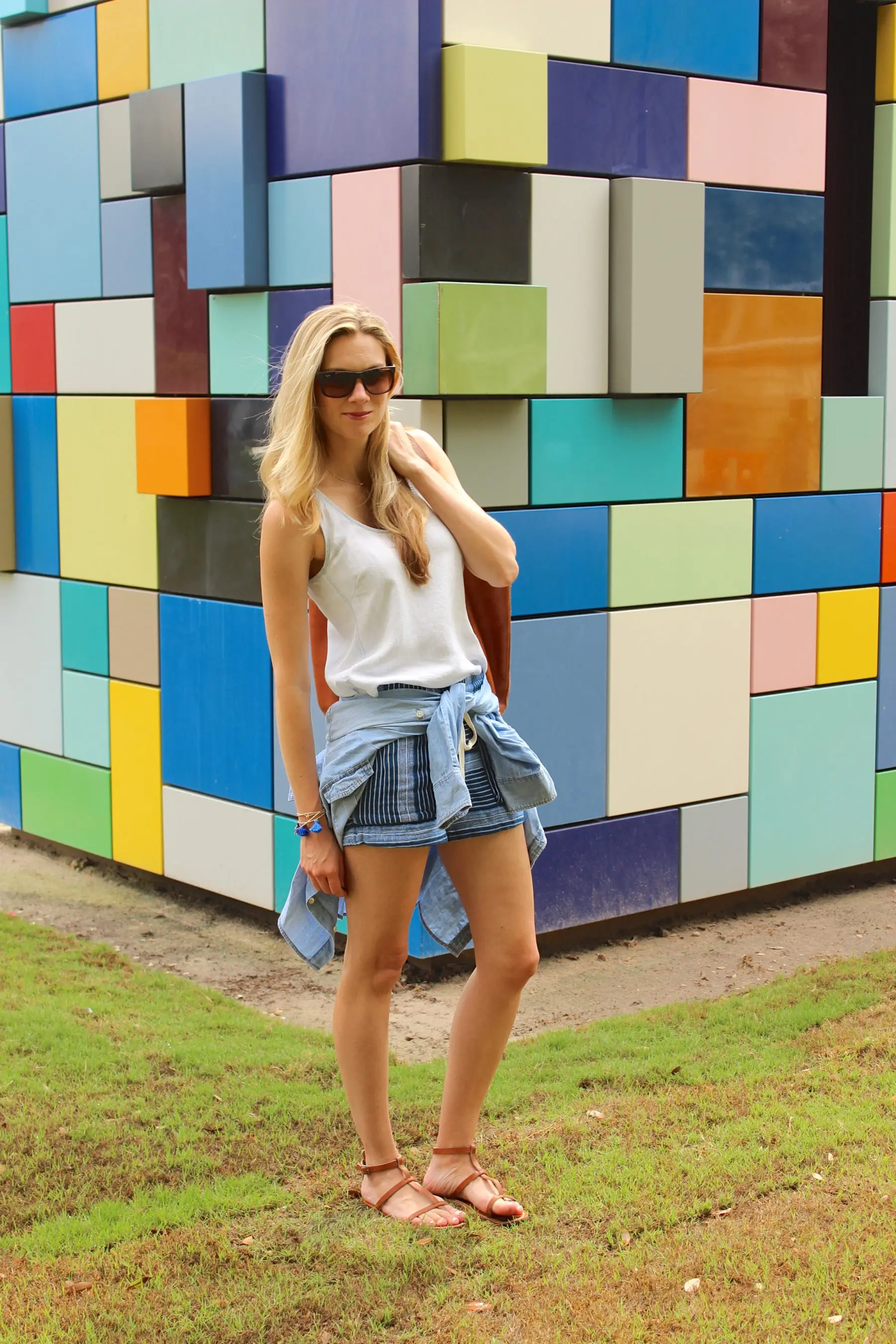Tank- Anthropologie, Shorts- Ann Taylor Loft, Shoes- K. Jacques in gold and here for similar, Chambray- J.Crew, Bag- Madewell, Necklace- Gorjana for similar, Earrings- Nordstrom for similar, Bracelet- Furbish, Sunglasses- Ray Ban