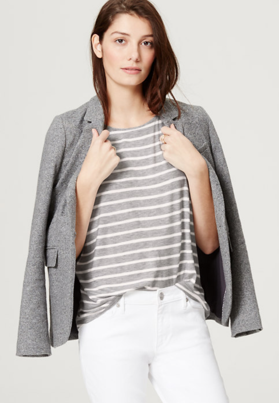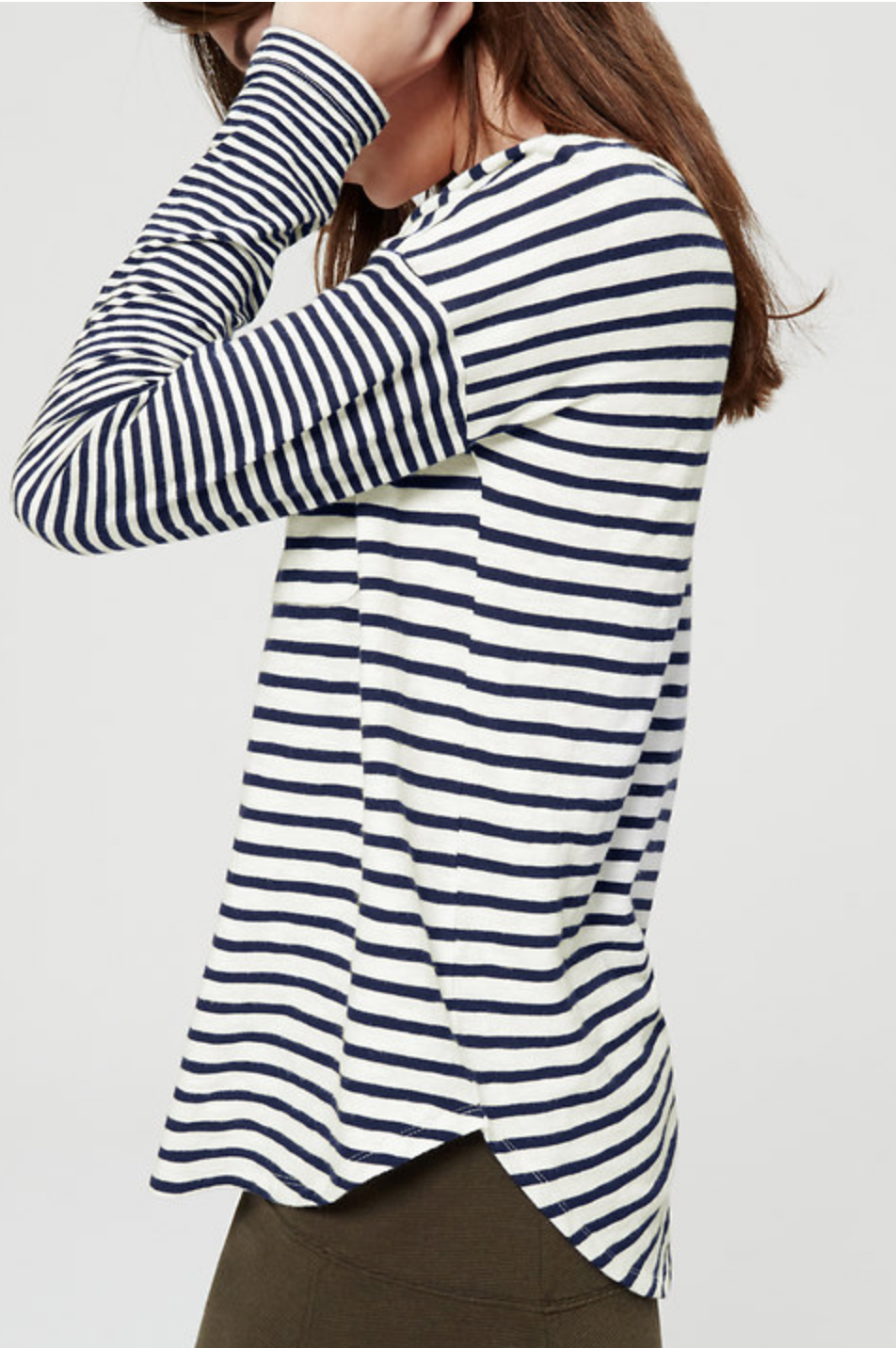 It’s a navy striped top, need I say more? Ha! In all seriousness, the fit was great. It fit well at the top and was slimming through the body. It didn’t hug the midsection, which was nice, and it looked cute sloppy tucked, too!