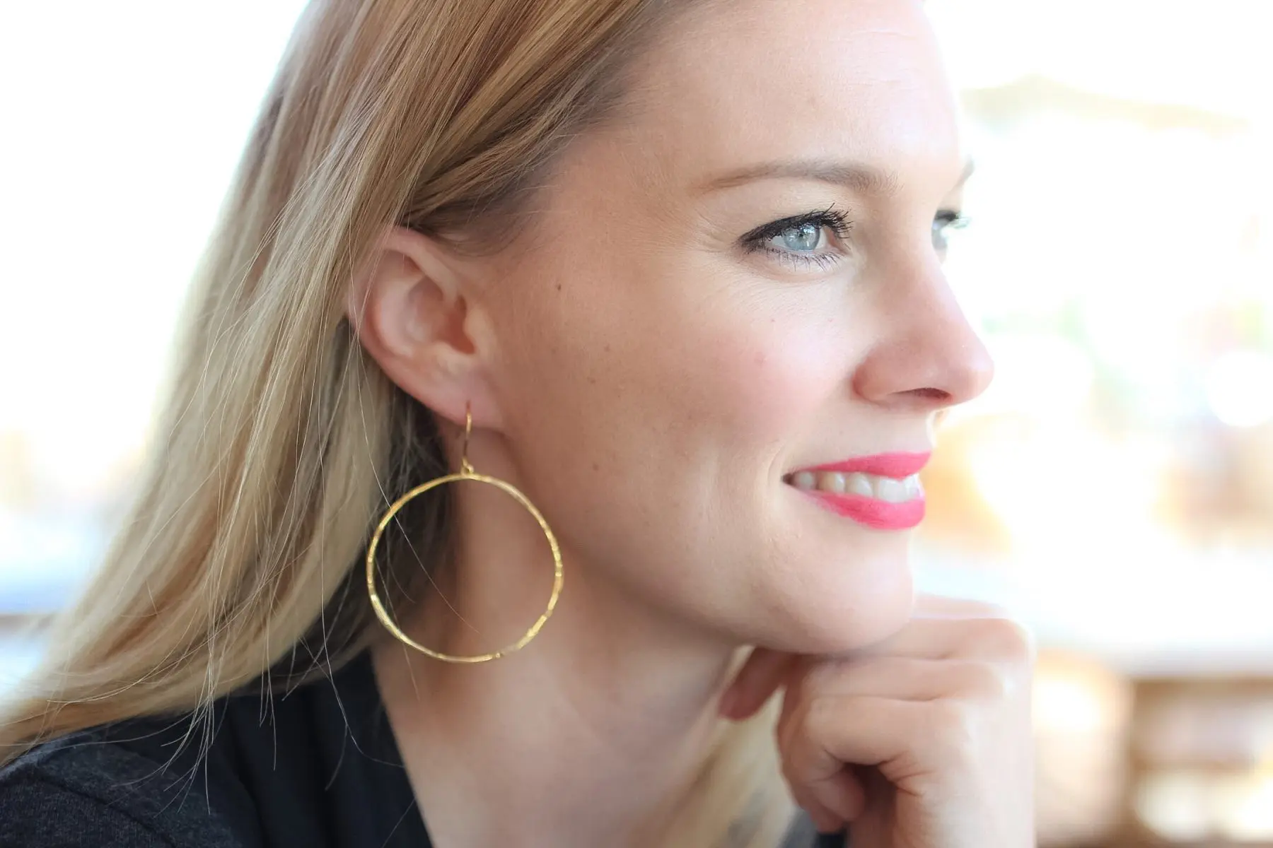 First up are these gold hammered circles… Ok, I know they look a lot like the hoops I wear all the time, but they’re not hoops by golly, so I bought them! And now I’m wearing them everyday -ha!