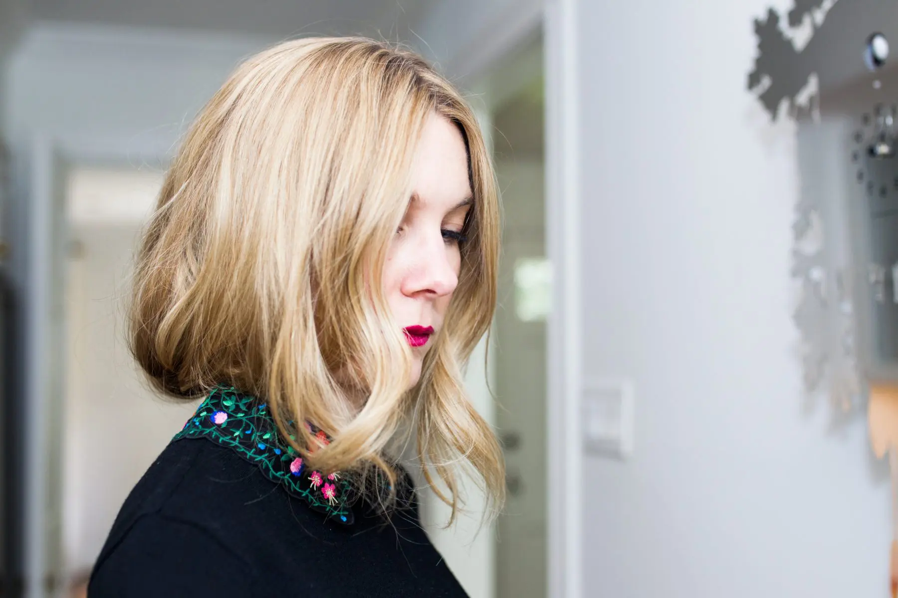 If the bob is too short, just start pulling the sides down so it comes out of the bun. Viola! A short bob that showed off my collar without cutting one piece of hair. This would be a really good hack if you get a wild idea to chop your hair off. Start with this hack and see how it goes! I decided to keep my hair long, but it was fun to change it up a bit!