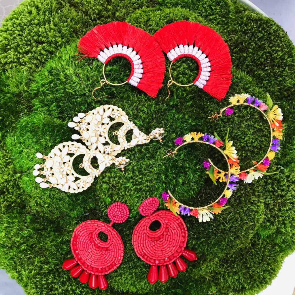 Earrings starting at the top going clockwise: Red Fan- @luckypeacockdesigns, Floral – Mercedes Salazar, Red Bead – Tuckernuck, Chandelier – J. Crew