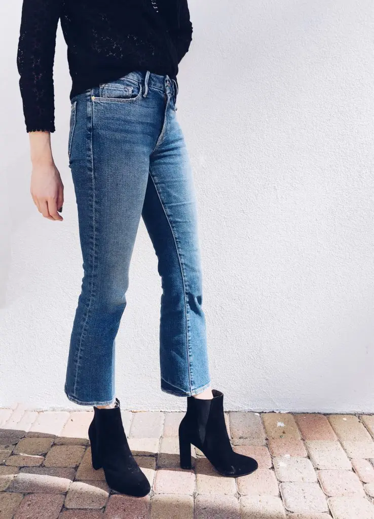 You know those trends that leave you scratching your head? Kinda like I’m doing right now with white booties… Ha! Well, I distinctly remember a conversation I had with a friend almost a year ago about the crop denim flare trend. Is it really coming back? Is it for the mature crowd? It looks hideous… Hahahaha!
