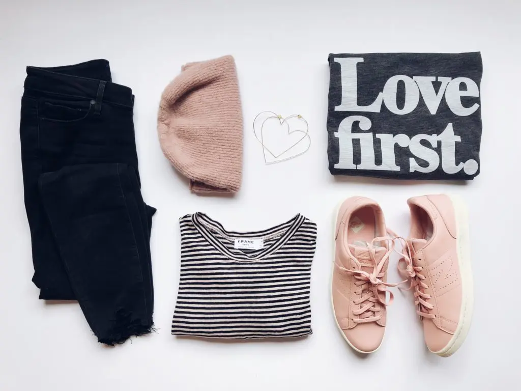 Outfit links: “Love First” Tee (s) – J.Crew, Stripe Tee (xs) – Frame, Jeans (tts) – Paige, Tennis Shoes (I went down 1/2 a size) – New Balance, Earrings- Anthropologie, Beanie- Madewell