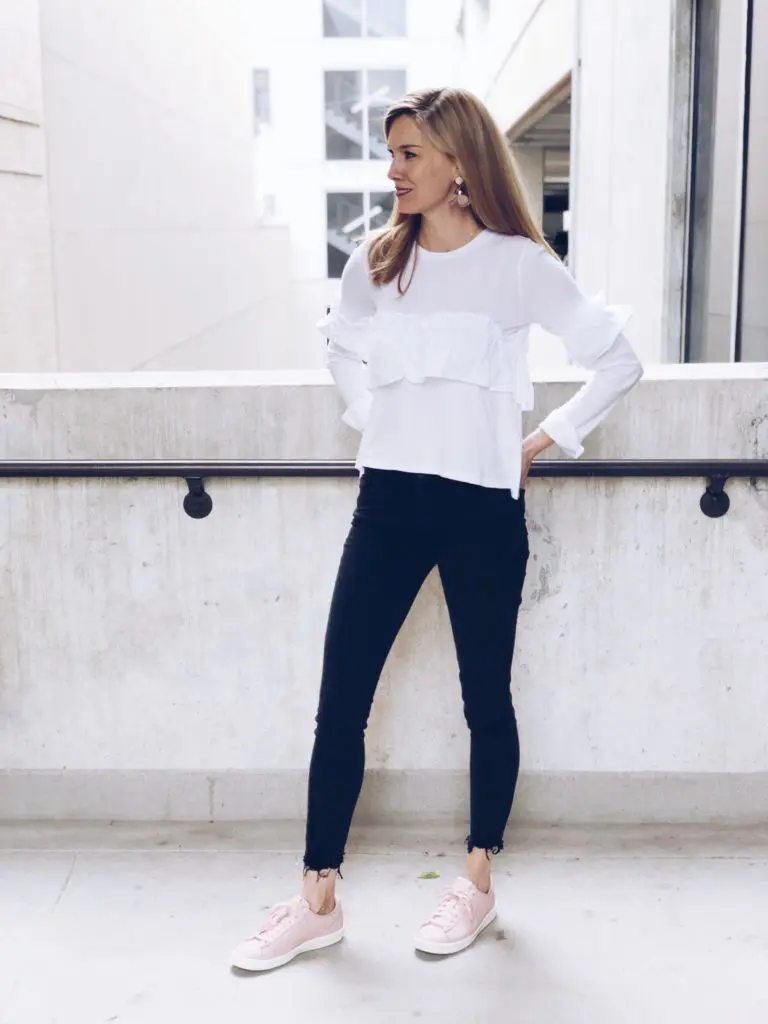 These are the pink sneaks I didn’t need, but I’ve had so much fun wearing them. I had a few questions about the color from last week’s post, and this is the best representation of the color I could get. So far I’ve worn them as seen above, with black jeans (below) and tees (below), and with an all grey look. I’ll post the all grey look on Instastory Highlights tomorrow. Sizing: Sneaker runs large, order down a 1/2 size