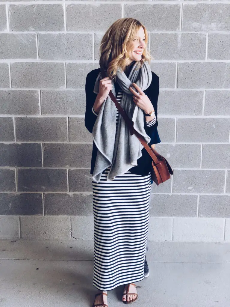You see, in my closet, I have a navy jacket to wear with this navy and cream dress, and I have a black bag to wear with the black jacket. But, I chose to mix my colors instead to keep it interesting, potentially like a Parisian would! I’ll have to say, it’s not normal for me to think to wear navy and cream with black. It’s also unusual for me to think of wearing brown accessories with a black jacket or to throw a grey scarf on top of all of those colors (I can be so matchy matchy -ha!), but I did and loved the way it turned out! So the next time you’re struggling with how to make an outfit, push through and use something in your closet! Mix it up and make it work! I bet it will look great! P.S. Did you notice anything odd in this photo? Here’s a clue…