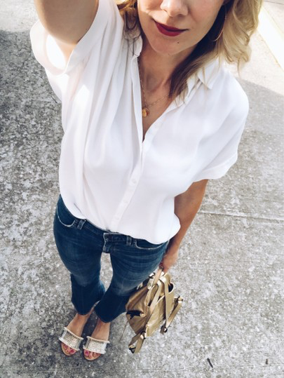Top- Milly, Denim- Citizen of Humanity, Shoes- Soludos, Necklace- Lulu DK, Sunglasses- Ray-Ban