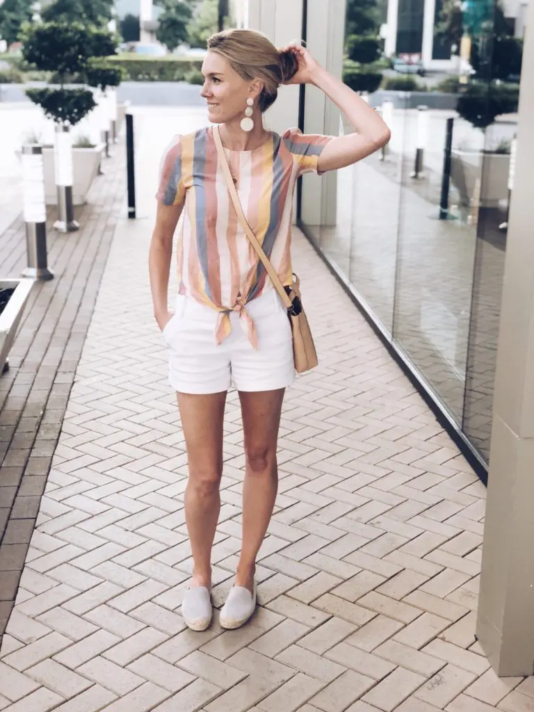 Top- Madewell, Shorts- Alice and Olivia, Shoes- Soludos, Bag- Madewell, Earrings- Lucky Peacock Designs