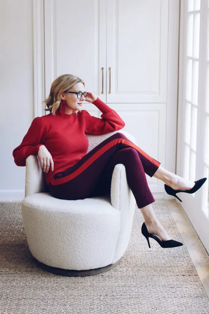 I just bought these pants, and I’m super excited to wear them! I think they are perfect for the holidays, and I definitely plan on wearing them beyond the holidays, too. Hello, New Years and Valentine’s- my red pants are coming for you! I’m actually wearing this look tonight to a party where I’m unsure of the dress. I figure you can’t go wrong with a cheerful, colorful outfit, right? This look is a great jumping off point for a look straight from your closet! Uh oh, I feel another equation coming on (hahaha)….