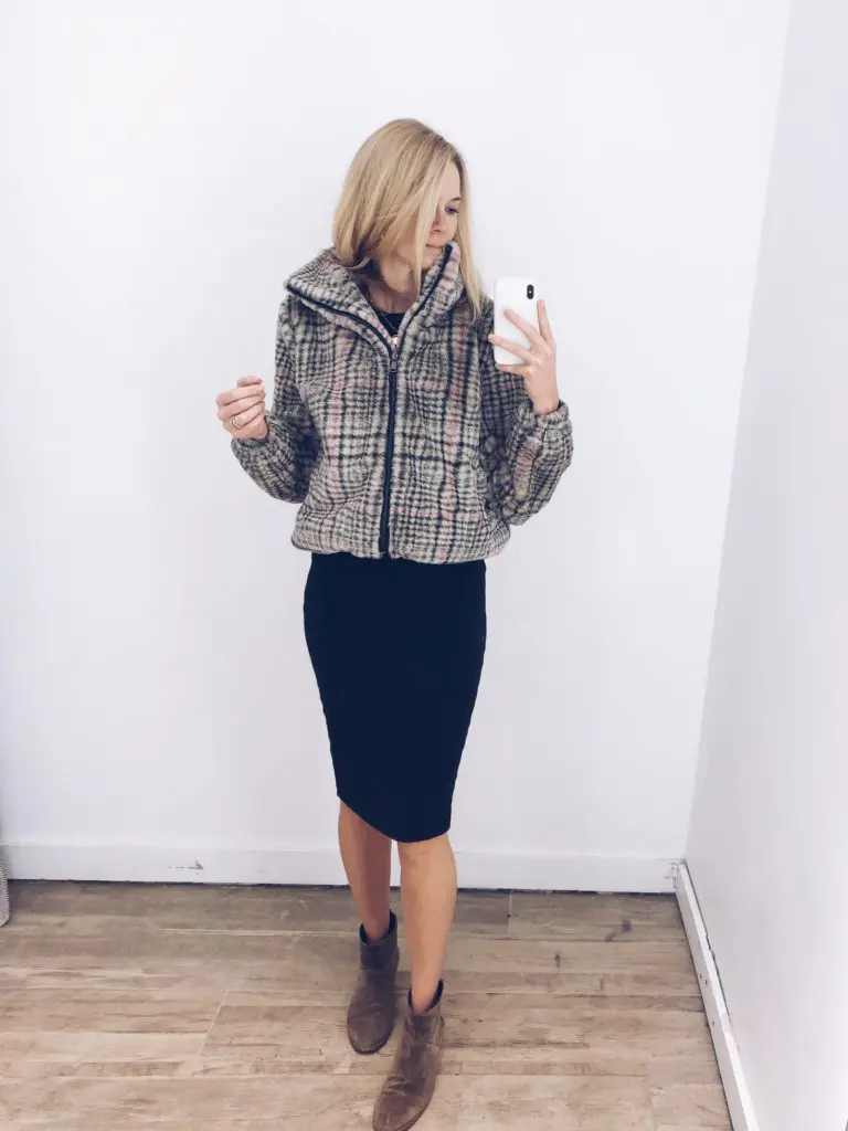 I love this jacket, but lets just think about something you have in your closet like this- a faux fur vest, a jacket, or a bomber jacket. This is the perfect base layer to get more mileage out of all these items already in your closet!