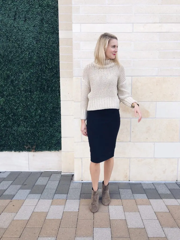 I love this look because it looks like I’m wearing a pencil skirt and sweater. The best part? When the sweater gets too hot for me, I can take it off and put it around my shoulders or tie it around my waist.