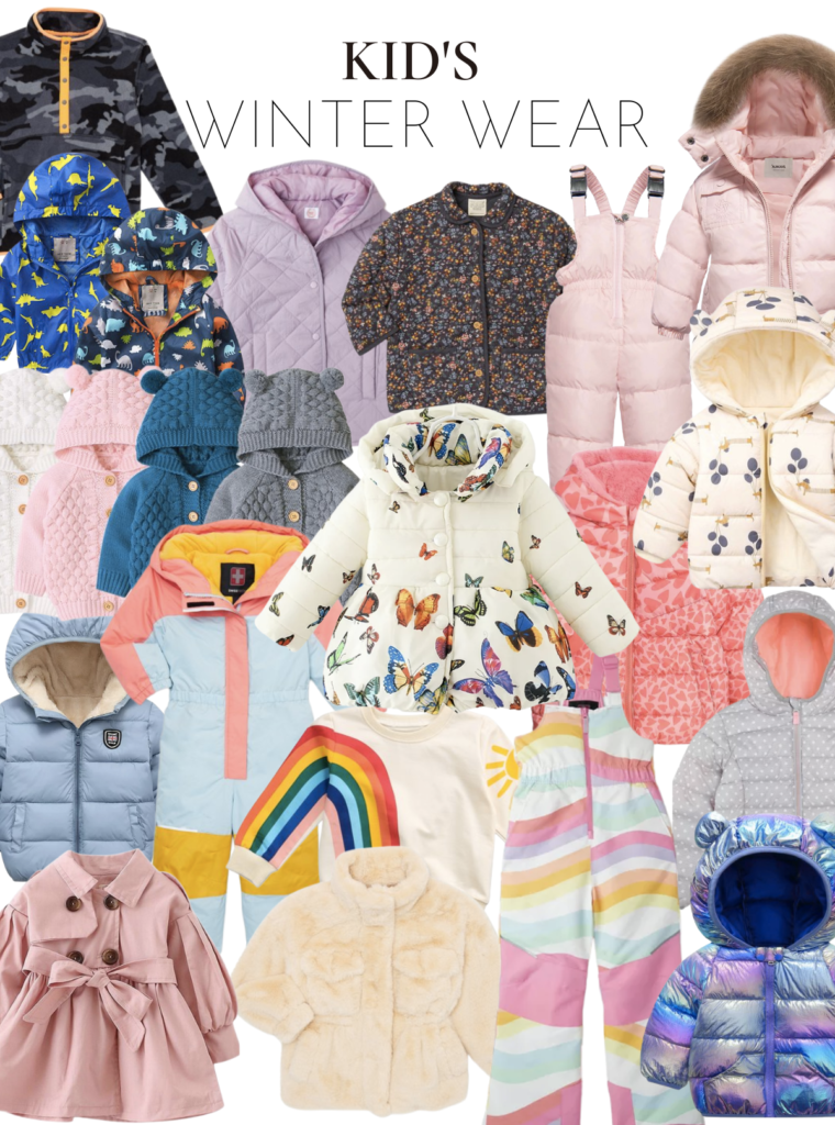 from top left: Camo pullover: Wonder Nation, Dino Jacket 2-pack: Actoyo, Purple Quilted Jacket: Wonder Nation, Floral Jacket: Easy Peasy, Pink Ski Bib & Jacket Set: Caretoo, White & Blue Jacket: Lenago, Pink Hearts Jacket: Swiss Tech, Gray Polka Dot Jacket: Rokka Rolla, Metallic Purple Jacket: Maxcozy, Patterned Ski Bib: Swiss Tech, Butterfly Jacket: Minkidfashion, Rainbow Sweatshirt: Dewadbow, Cream Faux Fur Jacket: Scoop, Blush Belted Trench: Lovebay, Colorful Snowsuit: Swiss Tech, Blue Puffer: Avail, Sweater 4-pack: Coutexyi