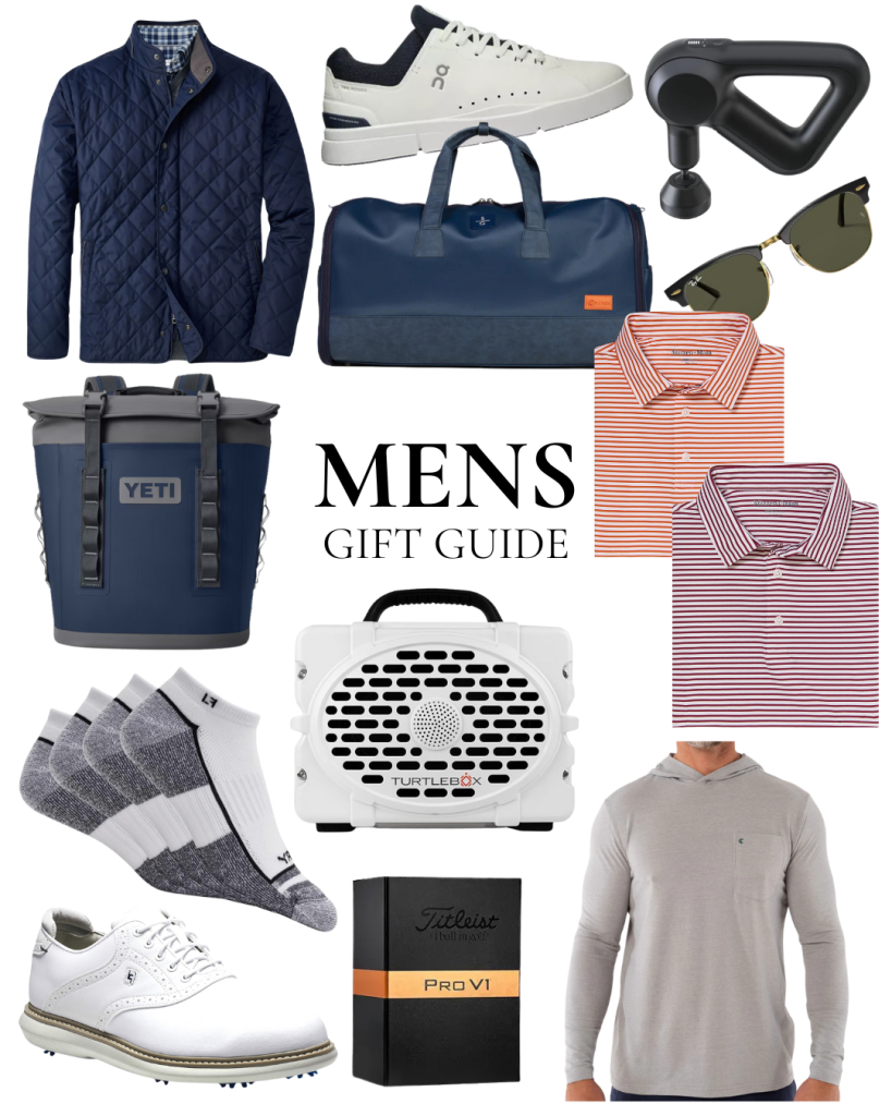 From top left: Coat: Peter Millar, Sneakers: On, Duffle/Garment Bag: STITCH, Massage Gun: Theragun, Sunglasses: Ray-Ban, Backpack Cooler: YETI, Socks: FootJoy, Speaker: Turtlebox, Golf Shoes: FootJoy, Golf Balls: Titleist, Pullover: Criquet, Polos: Burnt orange (Mizzen + Main), Maroon (Mizzen + Main)