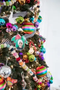 I used 2 different colorful fringe wall curtains, and I layered one on top of the other. The one on the bottom has purple, which shows through when the top layer moves! It really takes it up a notch (check it out in the video)!