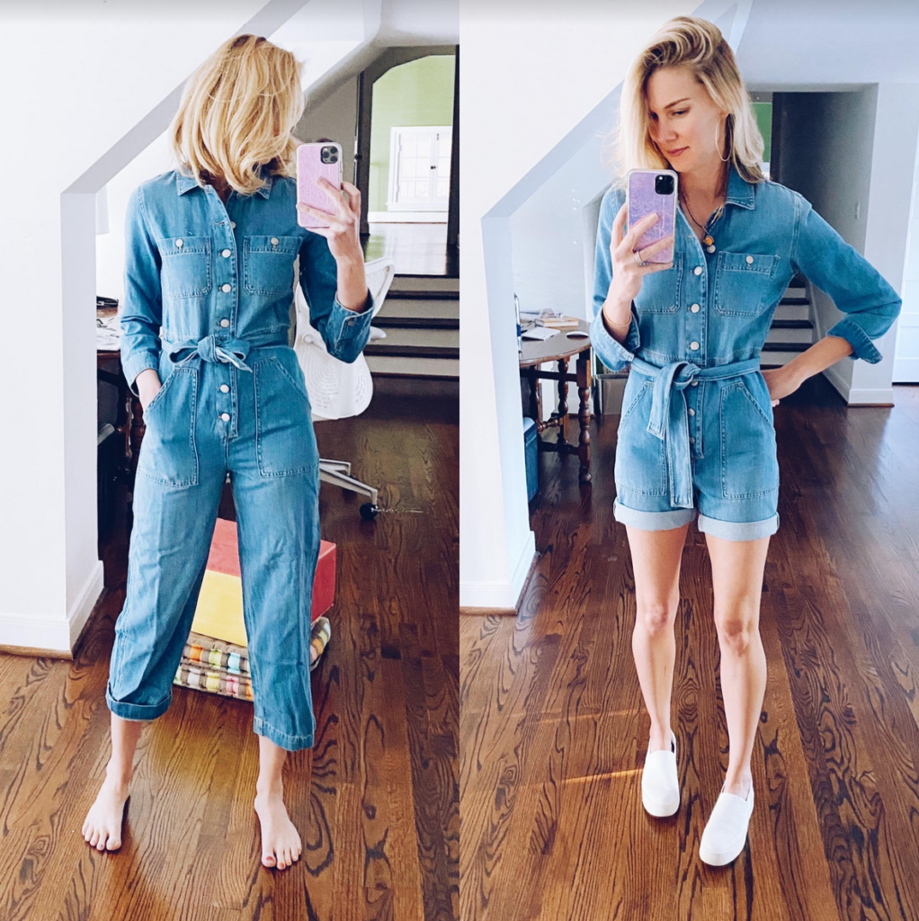3. Get creative. If you love a jumpsuit but don’t like the capri length or where it hits on your leg, cut them and make them into shorts (see what I did to this denim romper below). You can also cut, tie or knot tunics into the length that works for you. Buy longer shorts and cut them to the length you like! Have fun making it work!